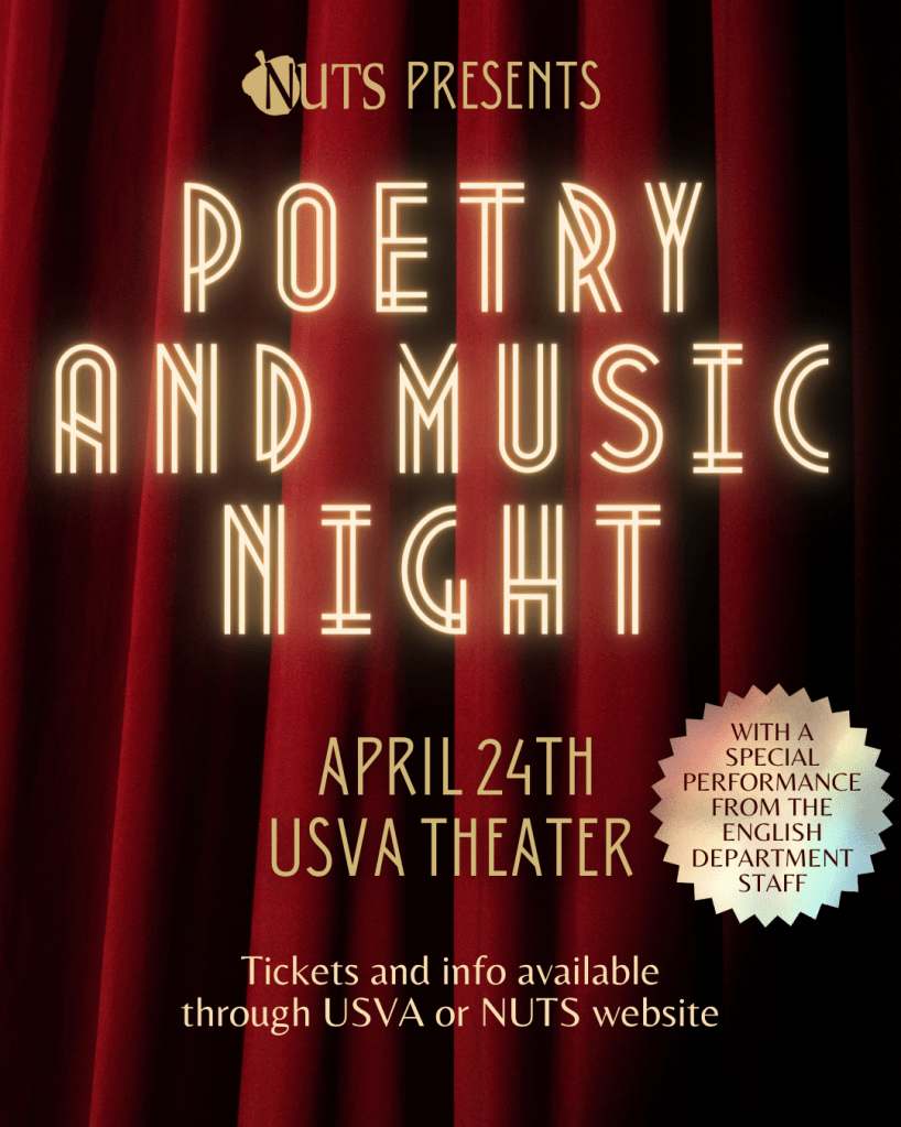 Poetry and Music Night is back and it’s better than ever! This year’s edition will be on the 24th of April at the Usva Theatre. We have a packed program of incredible poems and musical performances lined up for you guys, including performances by our very own English department staff and the NUTS Board. Walk-in will start at 18:30, with the first performance at 19:00. Tickets will be on sale soon, costing €2,- for members and €4,50 for non-members. Buy your tickets now at https://www.usva.nl/en/course-usva/nuts-presents-poetry-music-night!