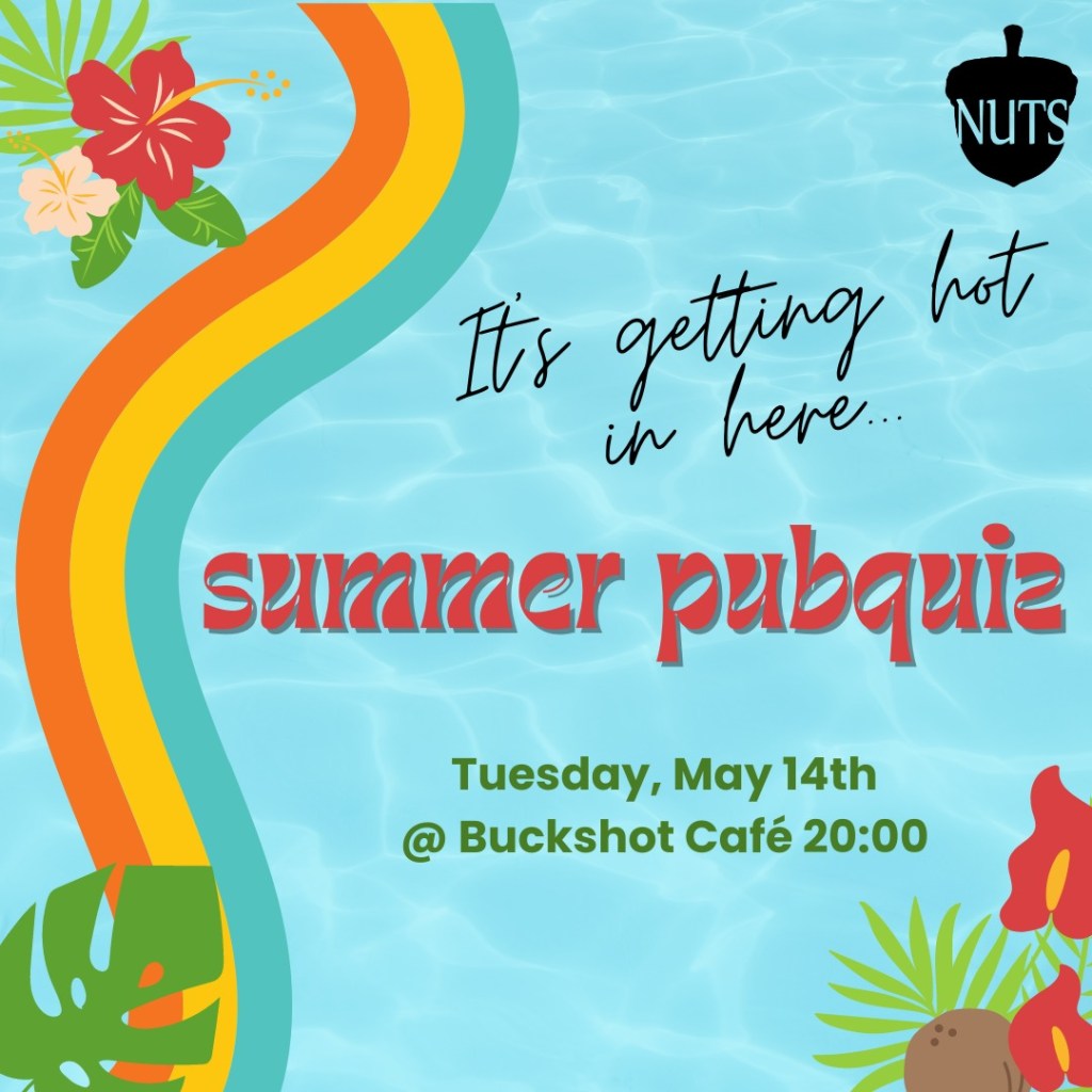 As the sun rises in the sky, it sets on the academic year. With this setting sun comes the very last NUTS pub quiz of the year, all about summer! ☀ With questions about summer activities, music, art and more, seize the day with us at Buckshot Café at 8pm to finish this year with a splash! 🌊⛱ As always, attendance is free for members and €2,50 for non-members.